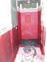 In the picture, Wino used mortar to fill in around the old ring, making it level with the subfloor and I've waterproofed it so the new ring can go in and get screwed down. The Red Guard states it will stick to drywall, metal, PVC, and cement/mortar. The point of this, in theory, is to give any water that might be leaking (which happens when wax rings get old) no place to go except out from under the toilet, alerting any observant person to the problem. Usually, the leak just soaks the sub floor around the ring, slowly rotting it away until it starts to drip from below. This can go unnoticed for a long time, meaning much more major repairs. (Also note the "baseboard" tile along the wall in this photo)
